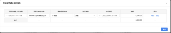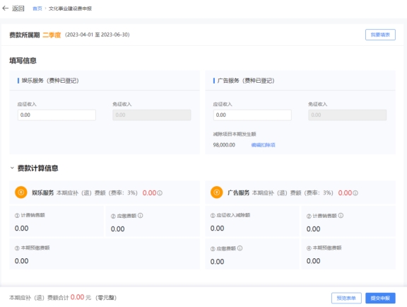 3)若繳費人同時發(fā)生廣告業(yè)和娛樂業(yè)應稅行為時,可在申報頁面分別填報《文化事業(yè)建設費申報表(娛樂服務)》和《文化事業(yè)建設費申報表(廣告服務)》《應稅服務減除項目清單(廣告服務)》。
