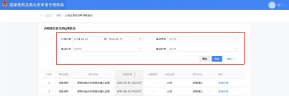 同時,該模塊也可以看到最近通過新電子稅局辦理的業(yè)務(wù)事項。您可在上方搜索欄通過選擇“辦理日期”、“事項類型”、“事項名稱”、“事項進(jìn)度”點擊【查詢】搜索想要查詢的業(yè)務(wù)事項,點擊【進(jìn)度詳情】,可查看詳細(xì)的辦理進(jìn)度。