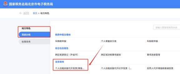 使用自然人身份登錄新電子稅局,是否可以代開自然人出租房屋增值稅電子普通發(fā)票?  答、可以,路徑為:【地方特色】—【我要辦稅】—【發(fā)票使用】—【個(gè)人出租房屋代開發(fā)票(增值稅電子普通發(fā)票)】?! D示指引如下  一、地方特色?! 《⑽乙k稅—發(fā)票使..
