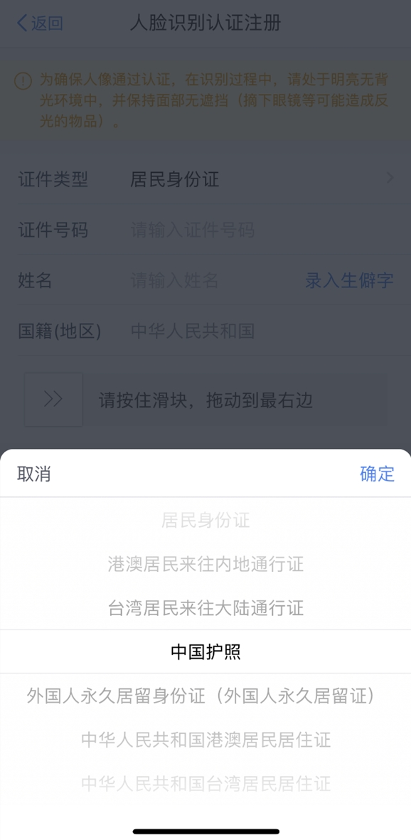 可以直接通過識別面孔進(jìn)行實(shí)名認(rèn)證,該注冊方式支持的證件類型包括:居民身份證、港澳居民來往內(nèi)地通行證、臺灣居民來往大陸通行證、中國護(hù)照、外國人永久居留身份證(外國人永久居留證)、中華人民共和國港澳居民居住證、中華人民共和國臺灣居民居住證。