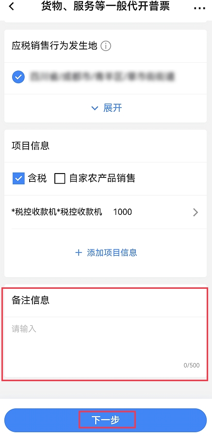 2.6、納稅人可在備注信息欄輸入備注信息,點(diǎn)擊【下一步】。