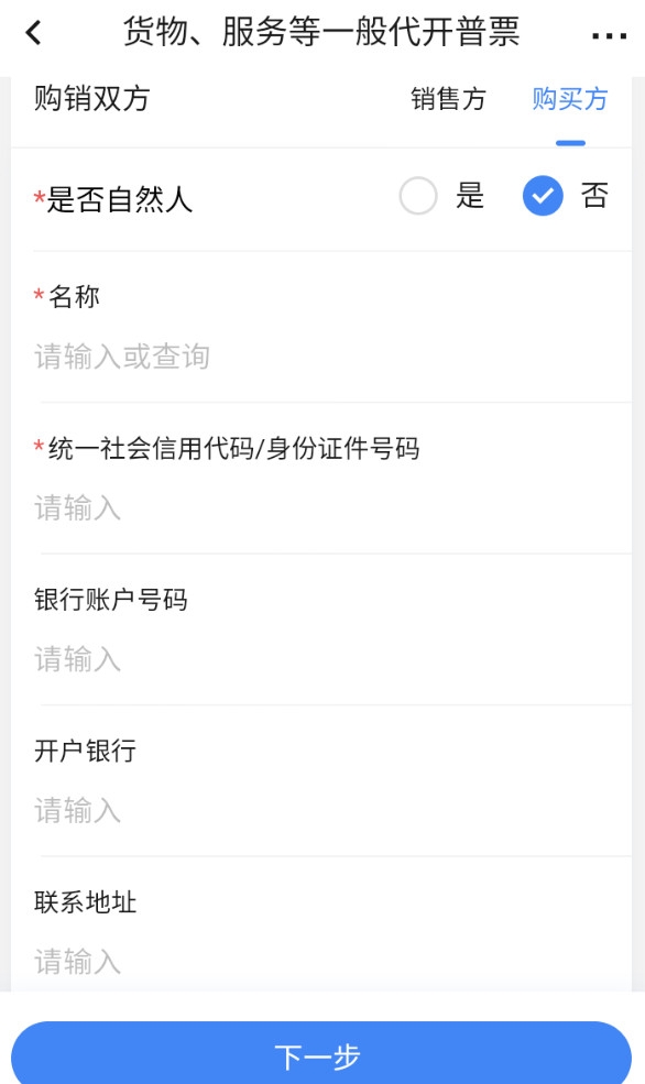 2.3、點(diǎn)擊“添加購(gòu)買(mǎi)方”,選擇是否為自然人,錄入購(gòu)買(mǎi)方信息:名稱、統(tǒng)一社會(huì)信息代碼/身份證件號(hào)碼、銀行賬戶號(hào)碼、開(kāi)戶銀行、聯(lián)系地址、聯(lián)系電話、選擇是否展示銀行信息,點(diǎn)擊【保存】。名稱項(xiàng)為必填,其他項(xiàng)為選填。