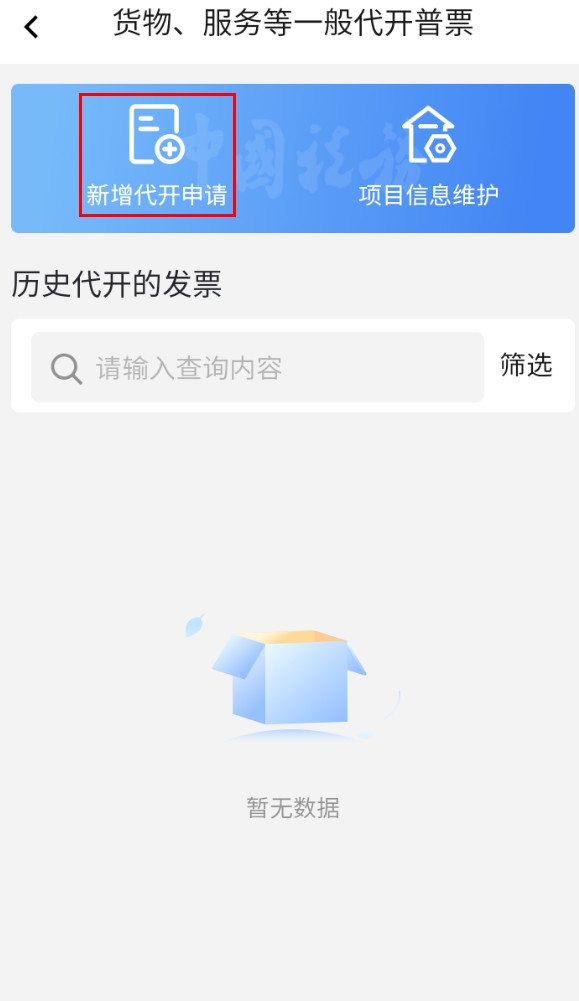 2.2、點(diǎn)擊【貨物、服務(wù)等一般代開(kāi)】-【新增代開(kāi)申請(qǐng)】進(jìn)入代開(kāi)申請(qǐng)頁(yè)面。