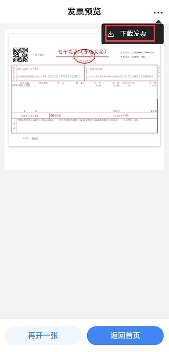 從開(kāi)具成功界面進(jìn)入發(fā)票下載界面:點(diǎn)擊【確定】,進(jìn)入發(fā)票預(yù)覽頁(yè)面,點(diǎn)擊相應(yīng)的按鈕,選擇“下載發(fā)票”進(jìn)行下載。