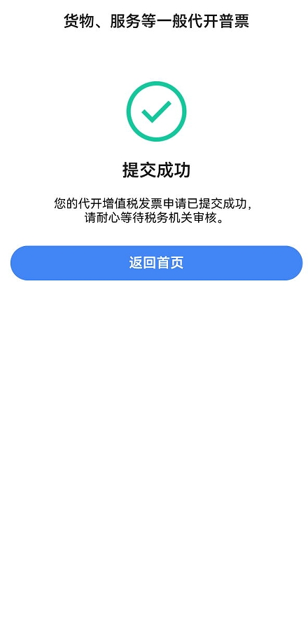 代開(kāi)申請(qǐng)?zhí)峤怀晒Γ瑹o(wú)需審核,無(wú)需繳款,可自動(dòng)完成數(shù)電票開(kāi)具;