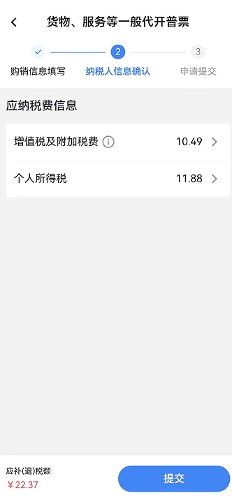 2.7、納稅信息確認(rèn):系統(tǒng)根據(jù)填寫(xiě)的發(fā)票信息自動(dòng)加載應(yīng)納稅款信息,納稅人確認(rèn)無(wú)誤后點(diǎn)擊【提交】。