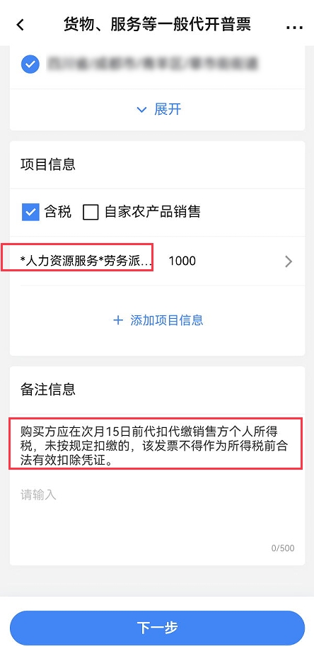 貨物、服務(wù)等一般代開(kāi)普票時(shí),若個(gè)人所得稅品目為勞務(wù)報(bào)酬、稿酬、特許權(quán)使用費(fèi)所得時(shí),納稅人信息確認(rèn)界面溫馨提示:本次代開(kāi)申請(qǐng)個(gè)人所得稅項(xiàng)目為勞務(wù)報(bào)酬、稿酬、特許權(quán)使用費(fèi)所得時(shí),由購(gòu)買(mǎi)方次月15日內(nèi)代扣代繳,如存在異議,請(qǐng)前往稅務(wù)大廳辦理。若為其他個(gè)人所得稅品目不顯示溫馨提示。