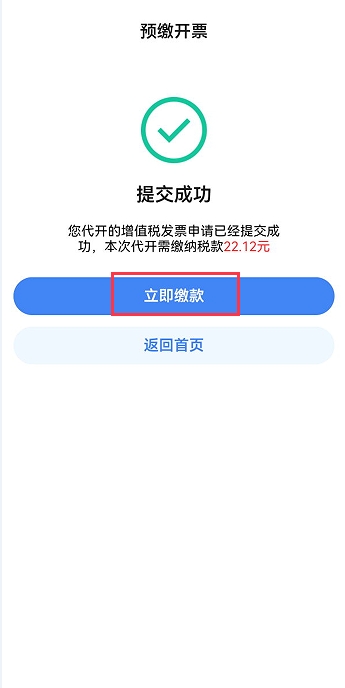 代開(kāi)申請(qǐng)?zhí)峤怀晒?,無(wú)需審核,需繳款,跳轉(zhuǎn)至預(yù)繳開(kāi)票頁(yè)面,繳款成功后,可自行開(kāi)具數(shù)電票;