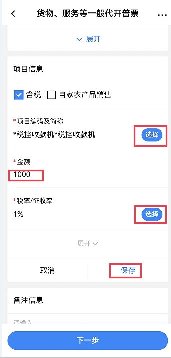 2.5、點(diǎn)擊“添加項(xiàng)目信息”錄入選擇項(xiàng)目編碼及簡(jiǎn)稱、錄入金額,選擇稅率,點(diǎn)擊【保存】。