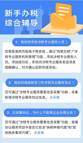 2.4、登錄為企業(yè),且該企業(yè)是涉稅專業(yè)服務(wù)機(jī)構(gòu),展示:我如何添加涉稅專業(yè)服務(wù)人員、我如何填報(bào)新簽訂的涉稅專業(yè)服務(wù)協(xié)議、已采集協(xié)議,為什么不能幫企業(yè)辦理業(yè)務(wù)等輔導(dǎo)信息。