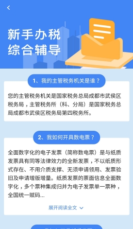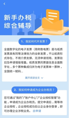 2.3、登錄為企業(yè),且該企業(yè)不是涉稅專業(yè)服務(wù)機(jī)構(gòu),展示:我的主管稅務(wù)機(jī)關(guān)是誰、我如何開具數(shù)電票、我如何開具紙質(zhì)發(fā)票、我如何辦理申報(bào)等輔導(dǎo)信息。