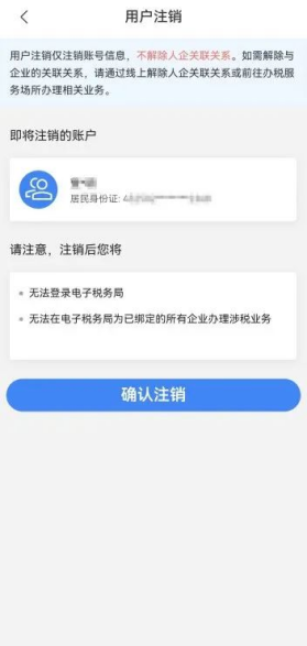 用戶進(jìn)入個人賬戶后,可以注銷身份。進(jìn)入賬戶中心頁面,點(diǎn)擊“用戶注銷”打開用戶注銷頁面,閱讀注銷提示后,點(diǎn)擊確認(rèn)注銷,完成用戶注銷(注意用戶注銷后,將無法登錄電子稅務(wù)局APP和全國各省電子稅務(wù)局,請用戶謹(jǐn)慎操作)。