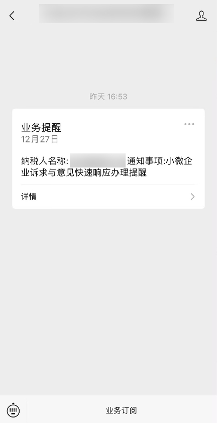 用戶通過關(guān)注微信公眾號:“北京稅務(wù)服務(wù)號”。經(jīng)實(shí)名手機(jī)號碼關(guān)聯(lián)綁定并且完成業(yè)務(wù)提醒訂閱后,即可通過個(gè)人微信接收新電子稅局APP的業(yè)務(wù)提醒與反饋,如服務(wù)提醒等,并可查看明細(xì)等。