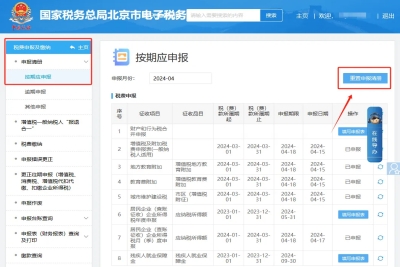 二、稅費(fèi)申報(bào)及繳納—申報(bào)清冊(cè)—按期應(yīng)申報(bào)頁面在右上角點(diǎn)擊“重置申報(bào)清冊(cè)”,然后帶出新的報(bào)表后請(qǐng)?jiān)偬顚懮陥?bào)即可。