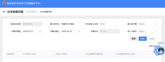 當(dāng)紅字信息確認(rèn)單狀態(tài)為購(gòu)銷雙方已確認(rèn)狀態(tài)或無需確認(rèn)狀態(tài)時(shí),納稅人可依次進(jìn)入【我要辦稅】—【開票業(yè)務(wù)】—【紅字發(fā)票開具】頁(yè)面,在常用功能模塊中點(diǎn)擊“紅字發(fā)票開具”,錄入查詢條件查詢到此前開具的紅字信息確認(rèn)單,點(diǎn)擊右側(cè)的“去開票”,進(jìn)入紅字發(fā)票開具頁(yè)面,之后正常開具紅字發(fā)票即可。