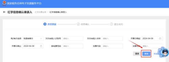 四、錄入查詢條件,點(diǎn)擊【查詢】按鈕,查詢需要紅沖的藍(lán)字發(fā)票信息。在查詢結(jié)果中點(diǎn)擊“選擇”后進(jìn)入【錄入紅字信息確認(rèn)單頁(yè)面】,在該頁(yè)面中若數(shù)電票票種選擇的是“電子發(fā)票”,點(diǎn)擊【提交】按鈕,提示:“尊敬的納稅人,您選擇紅字發(fā)票票種是“電子發(fā)票”,確認(rèn)方確認(rèn)后系統(tǒng)將直接生成紅字發(fā)票,請(qǐng)確認(rèn)是否繼續(xù)提交?”,點(diǎn)擊【確定】,紅字發(fā)票開具成功;若數(shù)電票票種選擇的是“與原藍(lán)票一致票種的紙質(zhì)發(fā)票”,點(diǎn)擊【確定】,跳轉(zhuǎn)到“提交成功”界面,提示紅字信息確認(rèn)單提交成功。