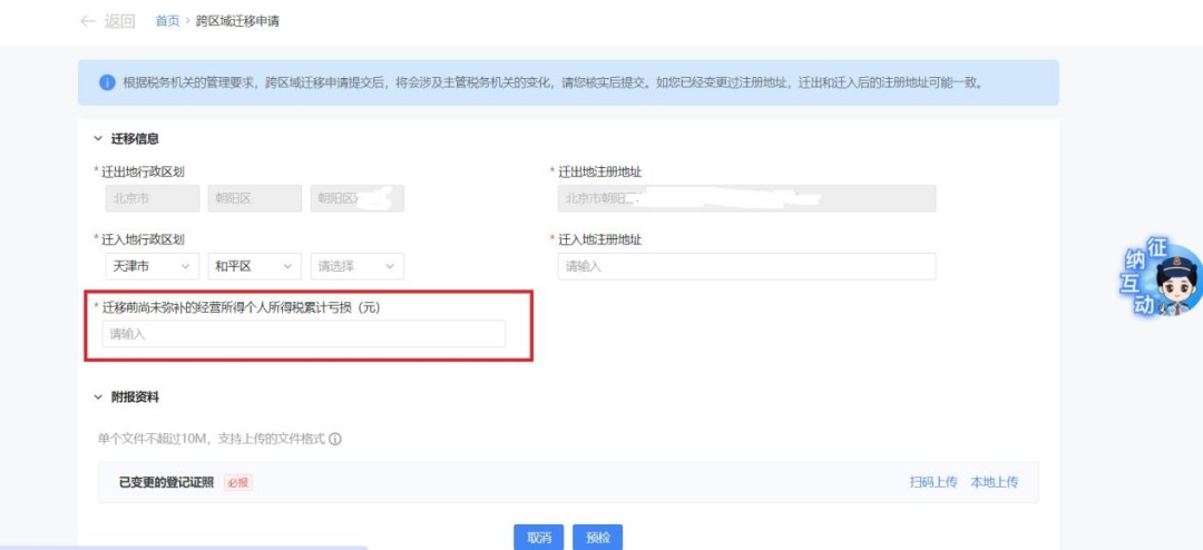 系統(tǒng)初始化功能界面,預(yù)填遷出地信息,手動(dòng)補(bǔ)錄遷入地省級(jí)(計(jì)劃單列市級(jí))、市級(jí)、區(qū)級(jí)行政區(qū)劃以及遷入地注冊(cè)地址、遷入地街道、遷移前尚未彌補(bǔ)的經(jīng)營(yíng)所得個(gè)人所得稅累計(jì)虧損(元)等數(shù)據(jù)項(xiàng)信息,并上傳已變更的外省市營(yíng)業(yè)執(zhí)照,點(diǎn)擊【預(yù)檢】。