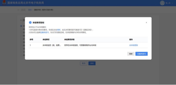 ?、倌蛇x擇辦理未結(jié)事項(xiàng),完成后點(diǎn)擊刷新,如無(wú)未結(jié)事項(xiàng)即可直接打印《清稅證明》; ②您也可以選擇簽署承諾書(shū),先行打印清稅證明,在承諾期限內(nèi)辦結(jié)未結(jié)事項(xiàng)。納稅人采用承諾注銷(xiāo)打印清稅證明后,未辦結(jié)事項(xiàng)可以通過(guò)登錄電子稅務(wù)局進(jìn)入該功能“未辦結(jié)事項(xiàng)告知”辦理。