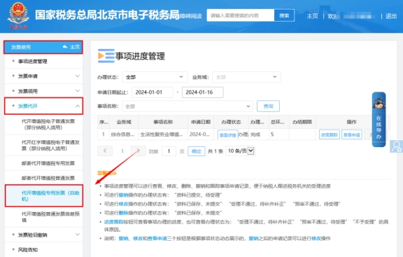 在電子稅務(wù)局上如何打印代開增值稅專用發(fā)票(自助機(jī))的清單? 答、您好,請(qǐng)點(diǎn)擊【我要辦稅】—【發(fā)票使用】—【發(fā)票代開】—【代開增值稅專用發(fā)票(自助機(jī))】,在申請(qǐng)記錄列表里,點(diǎn)擊后端【清單打印】選項(xiàng)?! D示指引如下 一、我要辦稅—發(fā)票使用。 ..