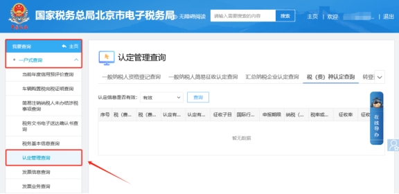 (2)請您點擊【我要查詢】—【一戶式查詢】—【認定管理查詢】—【稅(費)種認定查詢】,查詢條件選成全部查詢。
